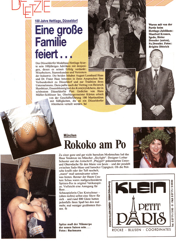 Zu einer ganz und gar nicht barocken Modenschau lud das Haus Tendenze ins Münchner „Skyline“. Der Designer Lothar Schuster und die Zeitschrift „Playgirl“ präsentieren Unter- und Oberwäsche für den Mann von heute – und der pendelt zwischen Sado-Maso und barocker Üppigkeit. Ob die Peitsche knallt oder der Taft raschelt, „mann“ muß untendrunter schon was bieten. Renner der Haute Couture Schau waren maßgeschneiderte Spitzen-Pos in original Vatikanspitze. Vielleicht eine Anregung für Rom...